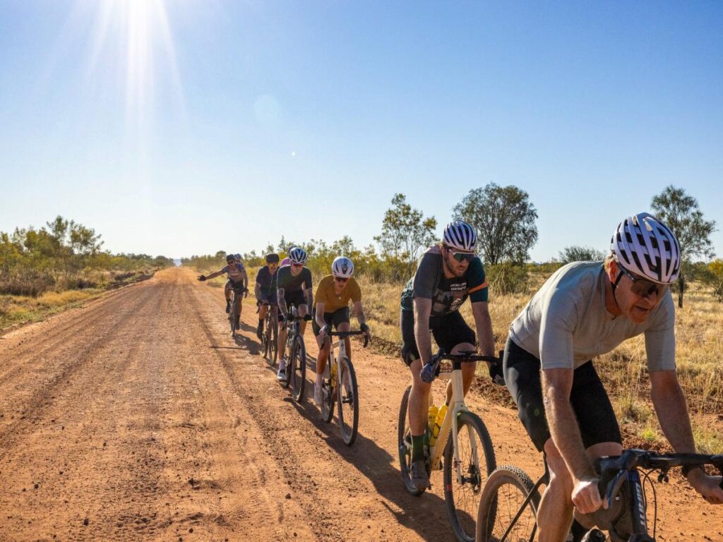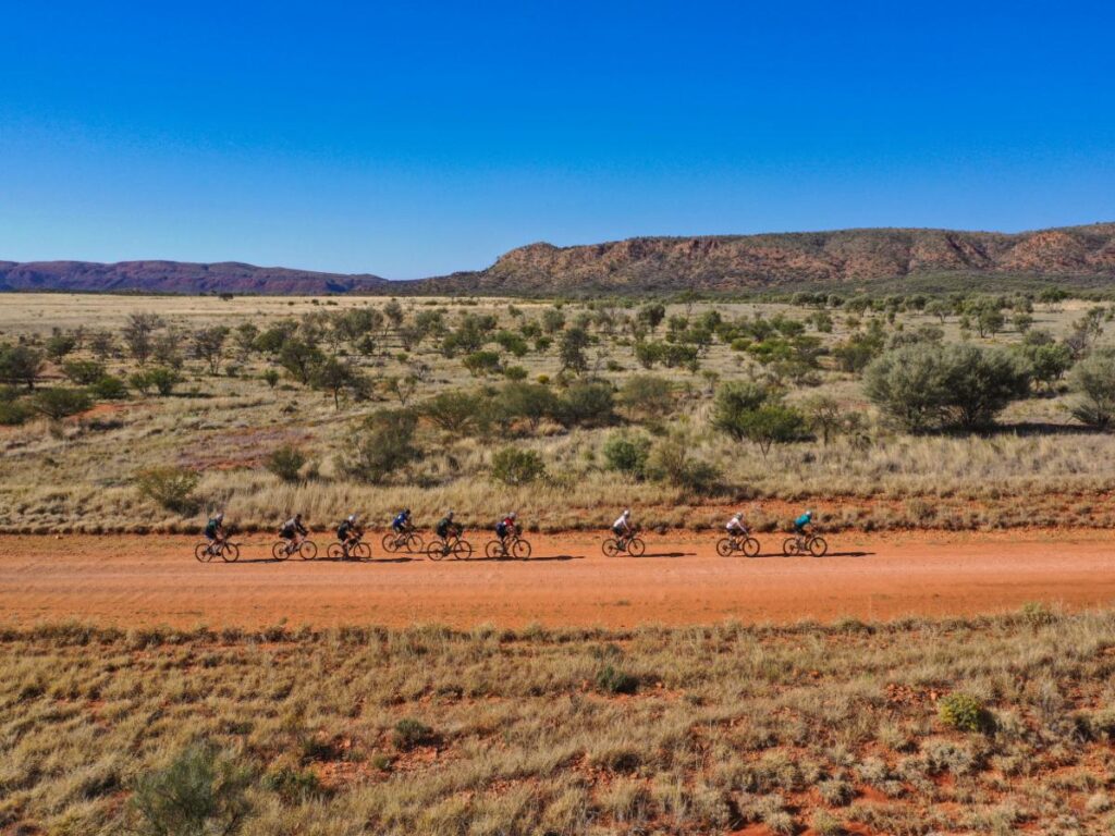 Once under way riders cruise south, going along some of the local gravel tracks at the base of the range. You’ll change from one side of the ridge to the other via Honeymoon Gap and continue on asphalt to the impressive Simpsons Gap, all in a non-competitive, social atmosphere. (Take some time to explore beyond the water point at Simpsons Gap because this is one of the region’s most spectacular natural landforms)