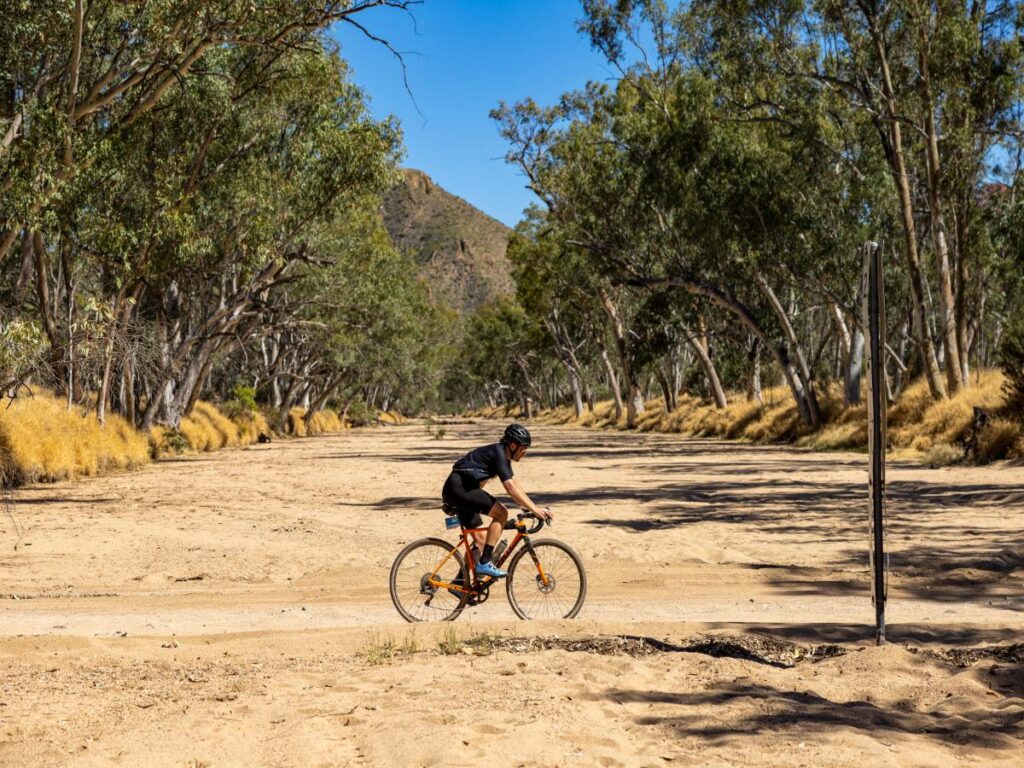 From the Bush Pub through to Trephina Gorge we ride into the heart of the East MacDonnell Ranges, with rugged mountain peaks looming up on the horizon and sheer rock faces and cliffs creating a vertical dimension in a very horizontal landscape. Racing across dry river beds and majestic ghost gums, past ridgelines and timeless rock formations makes this a captivating ride from start to finish.