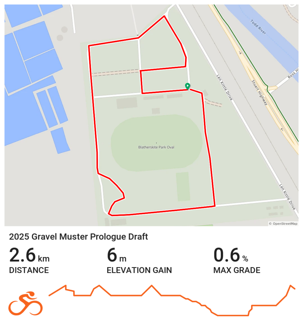 The course will go around the perimeter of Blatherskite Park, following a range of internal gravel roads and rougher double track interspersed with some twists and turns around trees on the grass akin to a cyclo-cross course. The course will not be technical and the whole prologue conducted with a friendly, welcoming atmosphere as we cheer on each rider around the course.
